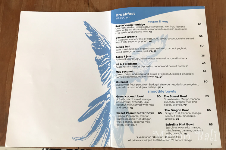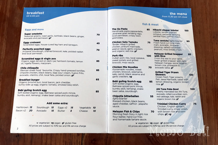 島内各地の新鮮なオーガニック野菜、チャングービーチで獲れた魚、ローカル製のハムやチーズなど、地産地消の洋食ヘルシー料理を提供しています。一部バリらしさを加えたアレンジメニューも。